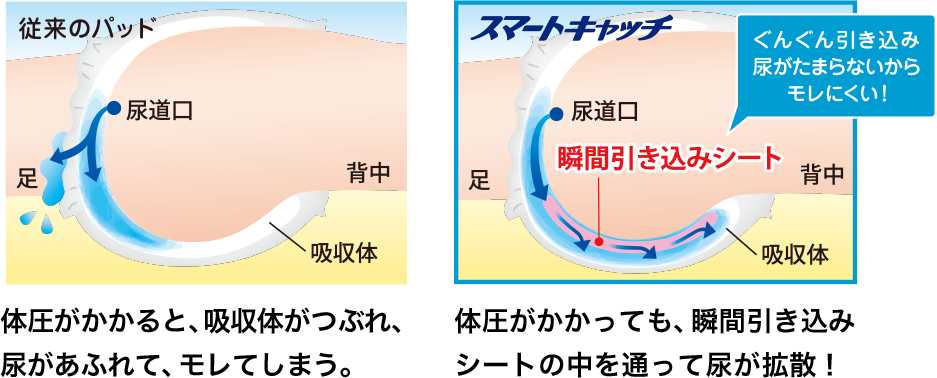 瞬間引き込みシートが尿を素早く吸収・拡散するので、パッド全面をムダなく使えます。