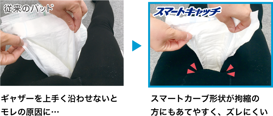 モレやすいソケイ部へも、ギャザーを沿わす手間なく、簡単キレイ装着。ズレにくい!